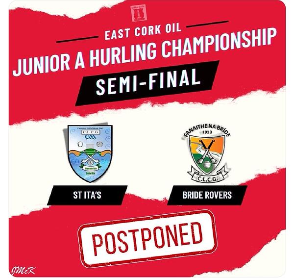 Todays East Cork JAHC semi-final has now been postponed due to an unplayable pitch. The game will be refixed for next weekend.