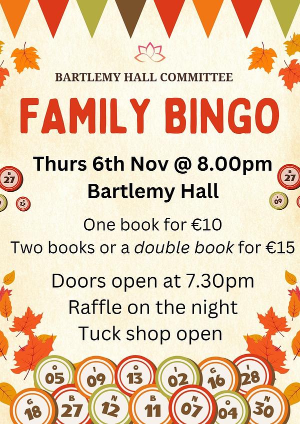 A Family Bingo night will take place on Thurs 6th Nov @ 8.00pm in Bartlemy Hall.