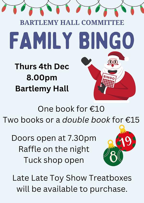 Then, on Thurs 4th Dec, the Family Bingo will take centre stage. With doors opening at 7.30pm, the first call will be at 8pm sharp. During both events, the Late Late Toy Show Treat Boxes will be available. Further information on poster below or at https://briderovers.ie/articles/170476