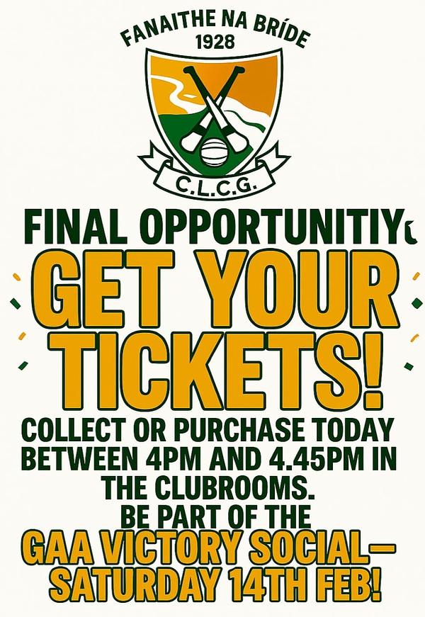 1¹🇮🇪 Final Ticket collection and payment take place in the clubrooms this Sunday, 4pm to 4.45pm 🇮🇪.