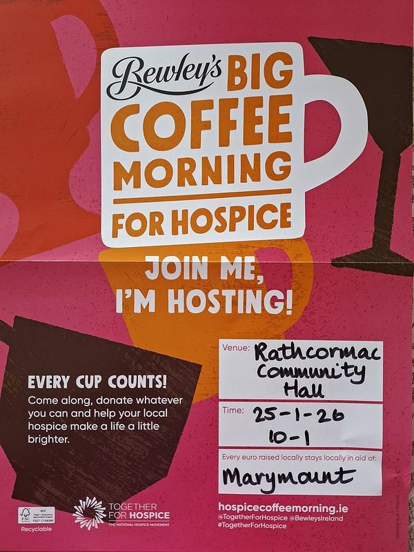 A coffee morning will take place in Rathcormac Community Hall on Sunday week 25th of January from 10am to 1pm.