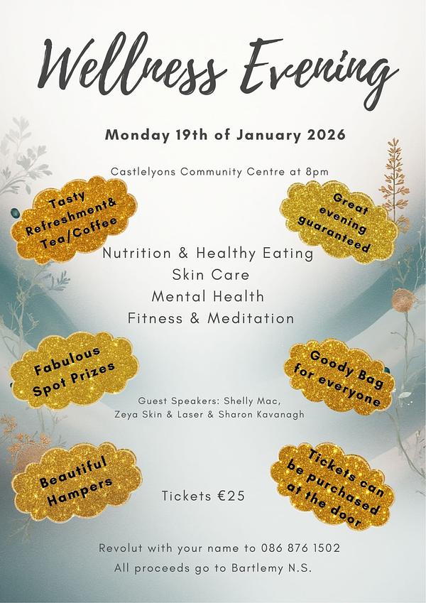 The Wellness Evening is on this coming Monday at 8.00pm in Castlelyons Community Hall 🌿