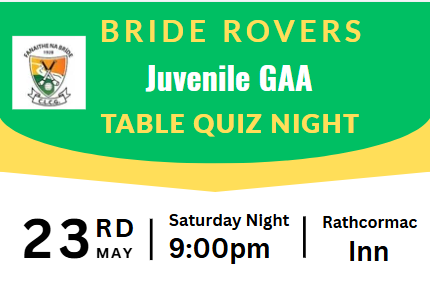 Join us for our Annual Juvenile Table Quiz, a fun night of questions, laughter, and community, all in support of Bride Rovers juvenile club. All proceeds supporting juvenile development in the club.