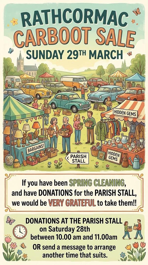 If anyone wants to donate unwanted items, they can bring them to the stall in the parish field between 10am and 11am on Sat 28th March.
